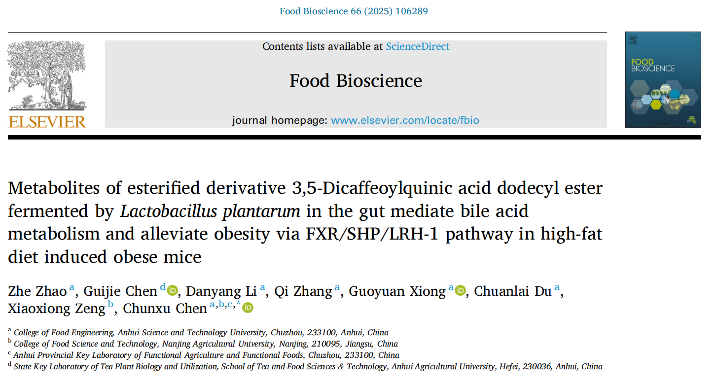 近日,食品科学与工程学院陈春旭副教授以通讯作者身份在国际Top期刊《Food Bioscience》(Q1,影响因子4.8)在线发表题为“Metabolites of esterified derivative 3,5-Dicaffeoylquinic acid dodecyl ester fermented byLactobacillus plantarumin the gut mediate bile acid metabolism and alleviate obesity via FXR/SHP/LRH-1 pathway in high-fat diet induced obese mice”的研究性论文。广发官方网站_广发(中国)股份有限公司,2022级食品加工与安全专业硕士研究生赵哲为论文的第一作者,广发官方网站_广发(中国)股份有限公司,为论文第一完成单位,南京农业大学曾晓雄教授课题组为合作单位。
