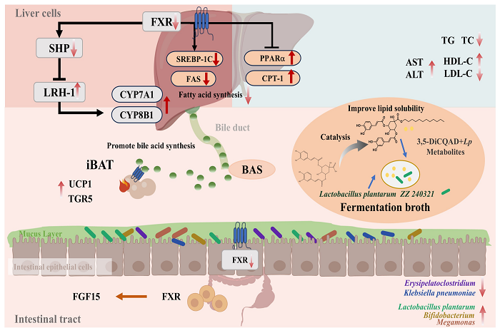 滁州,作为中国四大食用菊花产地之一,其特产滁菊(Chuzhou chrysanthemum)因独特的生长环境孕育了丰富的酚酸类活性物质,在功能食品领域备受推崇。该研究聚焦于滁菊的核心成分——3,5-二咖啡酰奎宁酸(3,5-DiCQA),揭示了其调节肠道菌群、抑制脂质合成方面的卓越潜力。然而,低亲脂性限制了其生物活性,限制了其应用价值。为破解这一瓶颈,陈春旭团队以滁菊中3,5-DiCQA为原料,成功合成并表征了其十二烷基酯衍生物(3,5-DiCQAD),显著提升了其亲脂性和生物活性。这一创新不仅增强了其在肠道中的吸收利用,还促进了有益菌L. plantarum的显著富集,进一步放大了其健康益处。研究进一步发现,3,5-DiCQAD在调节糖代谢和改善胰岛素抵抗方面展现出巨大潜力。团队成功分离出肠道中L. plantarumZZ240321菌株,并证实其发酵3,5-DiCQAD后的代谢物可激活宿主FXR/SHP/LRH-1通路,调控胆汁酸代谢,有效缓解高脂饮食诱导的肥胖症状。